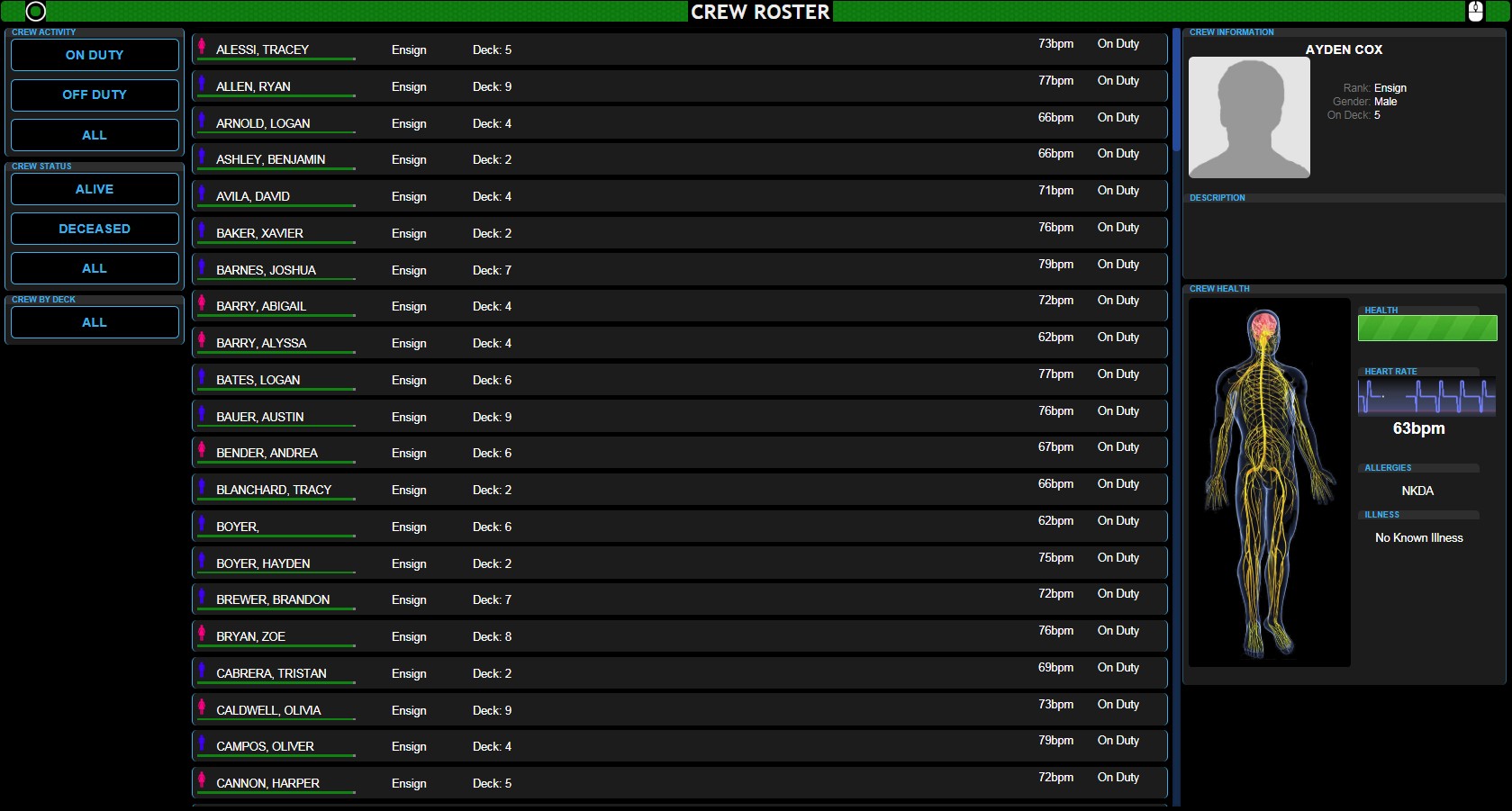 The 1st Officer is responsible for the Operations on the ship. This includes Crew health, Life Support, Environmental Controls and the like.