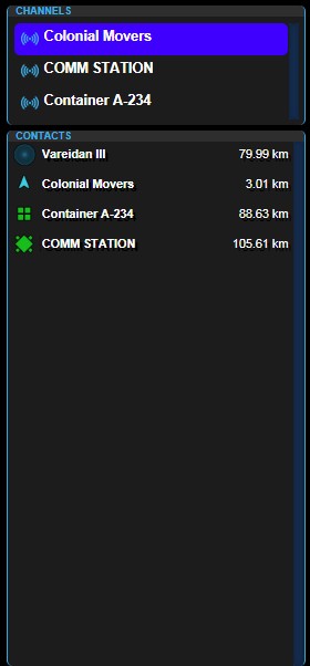 The Channels and Contacts panel on the upper left side of the Communications Officers Console shows both OPEN communication channels and a list of contacts that communication MAY be possible with.