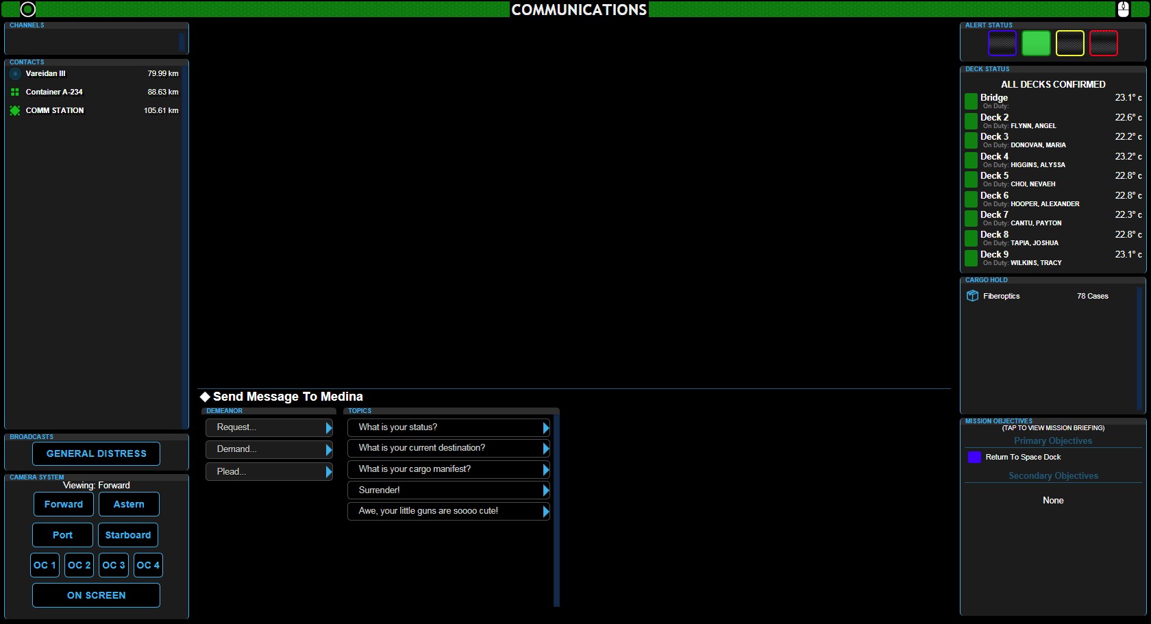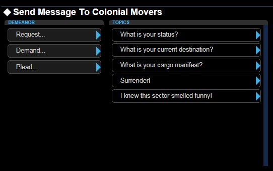Once Demeanor is set, select from the list, the message you want to send to the selected OPEN channel. Your message AND any response will be shown in the MAIN COMMS Window (below)