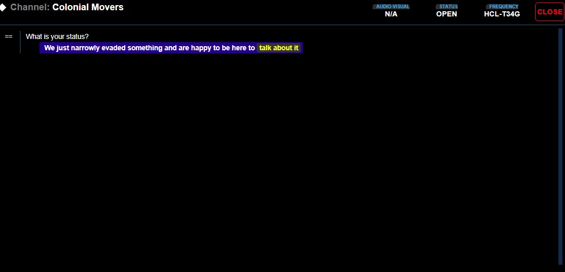 The Top-Center window of the Communications Console Station screen is the Main Comms Window. This window shows the various communications with the various targets you’ve interacted with.