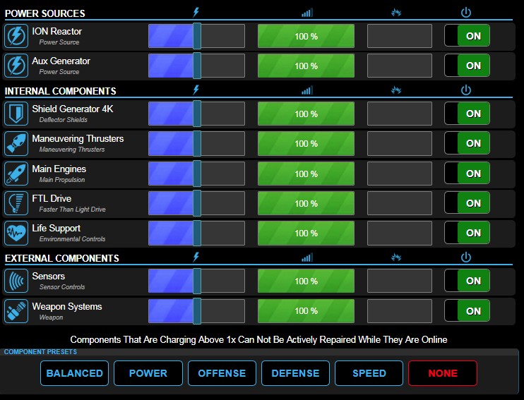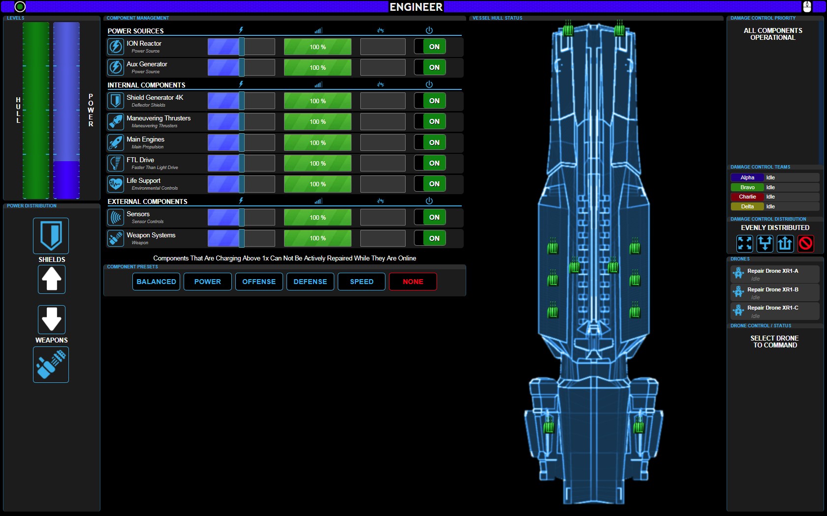 As the Engineer, you may choose to OVERPOWER the system to get more out of it. Unfortunately, you do this at a cost. The first cost is that you LOSE the ability to have a Damage Repair Crew fix that system. Those repair people can’t go near a system that’s being overpowered. The second cost is actual damage to that system as its components were NOT designed to be pushed to that level and those components start to fail.
