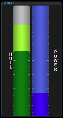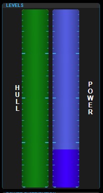The Hull and Power Meters are located in the upper left of the Engineering Console Screen. Each Meter can show 3 possible colors. The HULL meter is Dark green, Light green and gray.. The Power meter is the same except with Dark Blue, Light Blue and Gray.