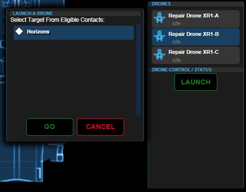 The drone will launch, repair the target and AUTO-Return to the ship.